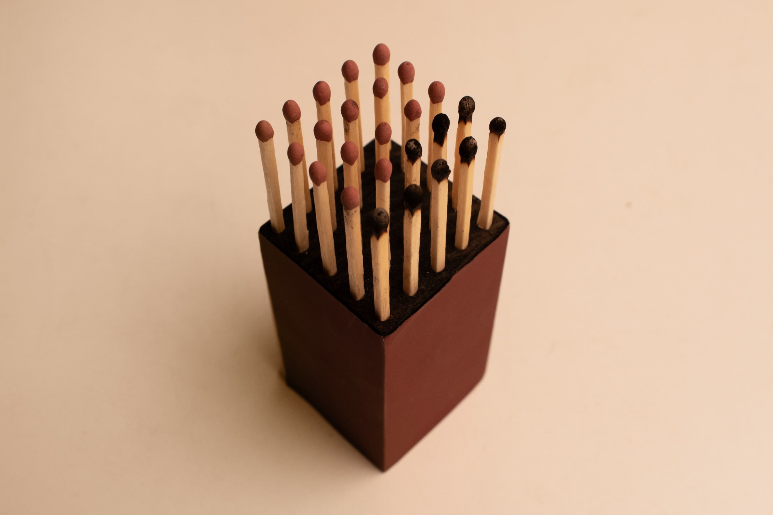 Precisely drilled holes help to align the matches in a grid, creating a sense of order and austerity. The matches embed themselves into a plinth-like structure, proportioned to feel like a monument — or a gravestone.